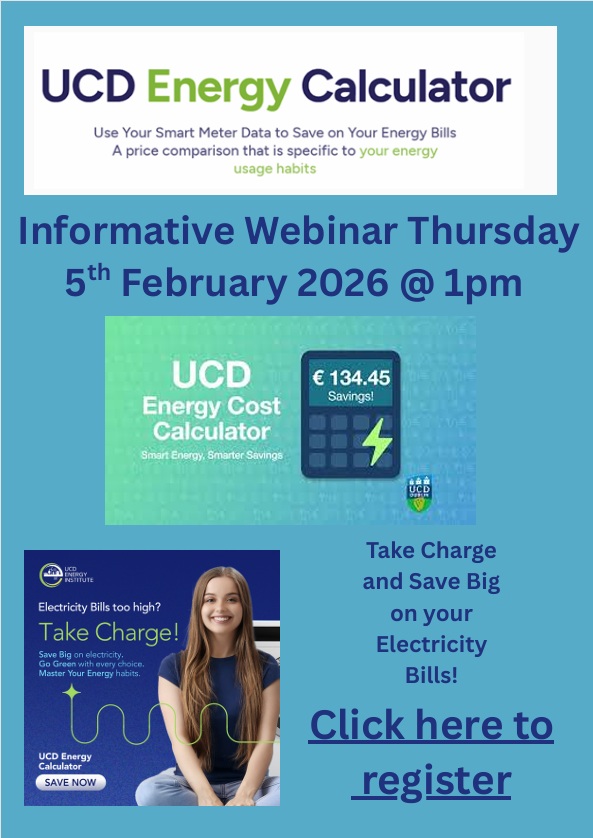 Register here for the upcoming online webinar, focused on helping households use their smart meter data to better understand energy usage and reduce electricity costs. In this session, the UCD Energy Institute will explain how the UCD Energy Cost Calculator works and how it uses your smart meter data to provide a personalised energy price comparison based on actual usage habits. Attendees will learn how to identify tariffs that may better suit their household and how to get the maximum benefit from this tool.